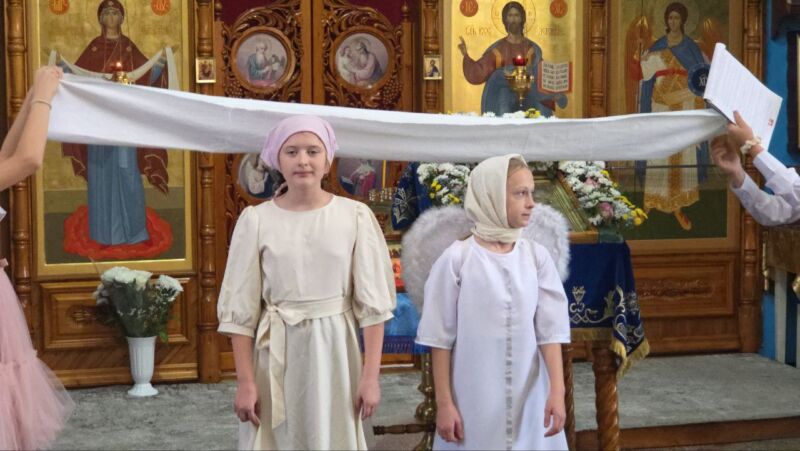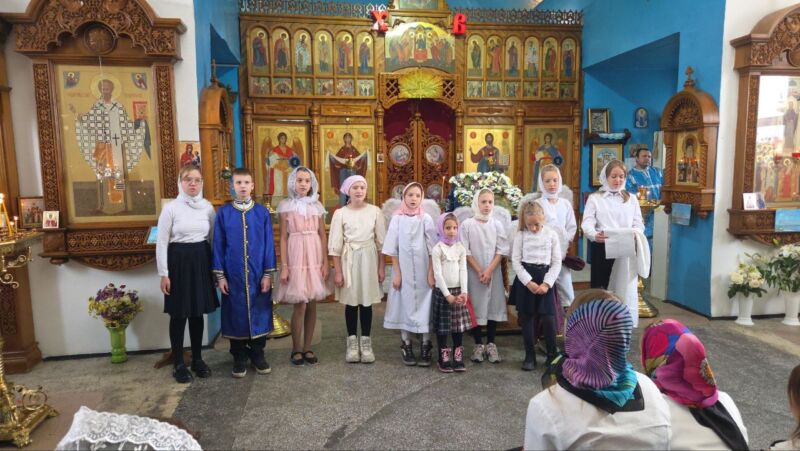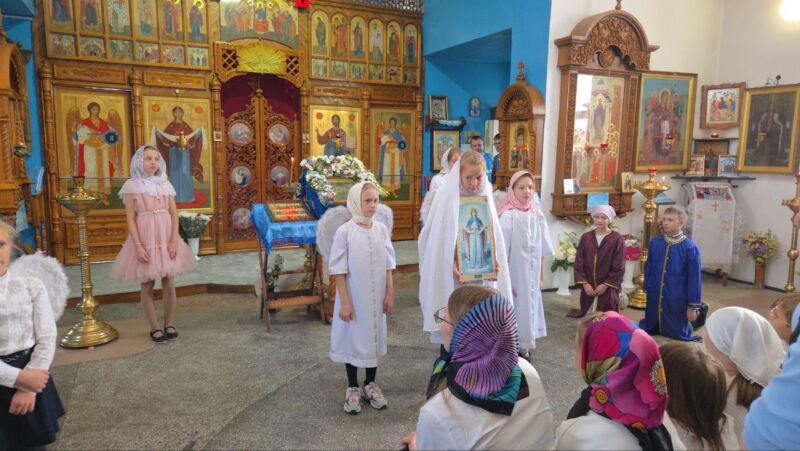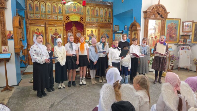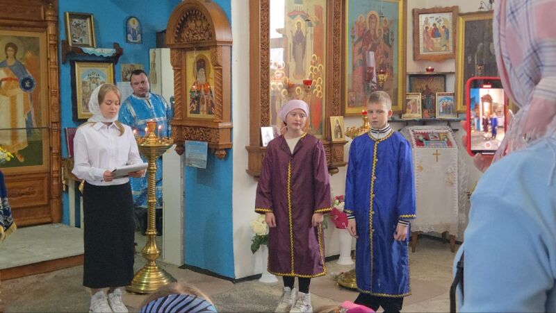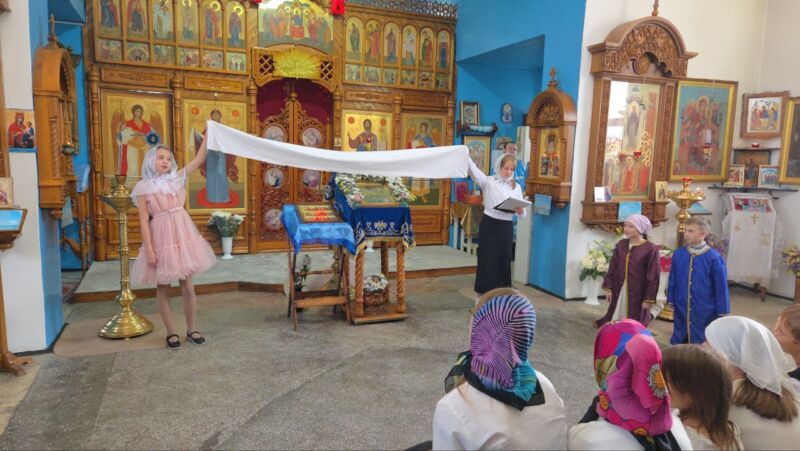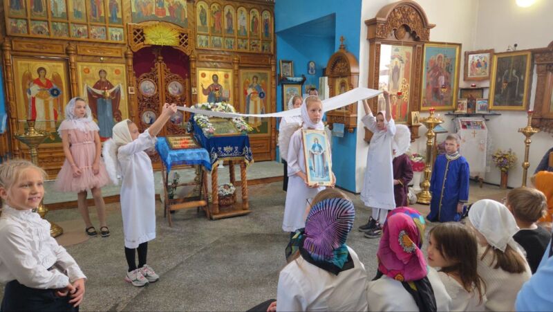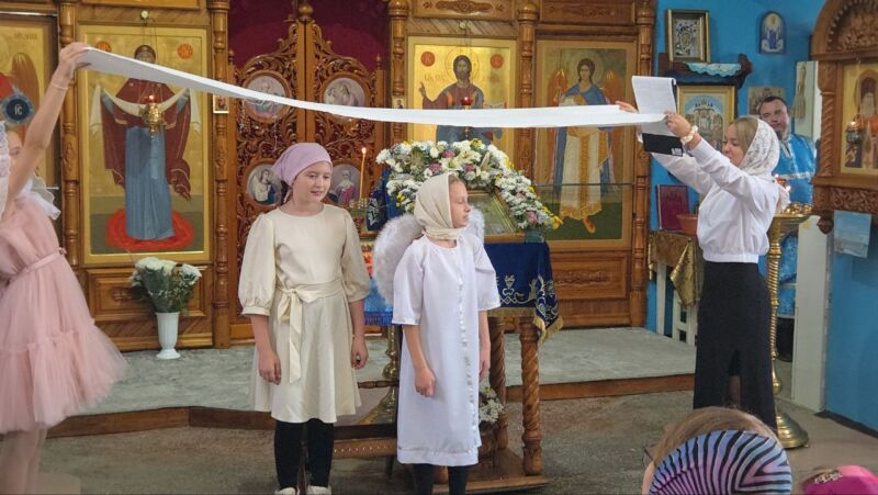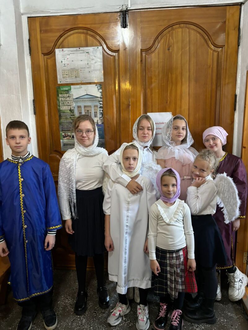 По окончании Божественной Литургии, гости показали прихожанам храма постановку, посвященную прошедшему празднику Покрова Пресвятой Богородицы. А воспитанники Воскресной школы г. Татарска спели песню «Матерь Богородица».