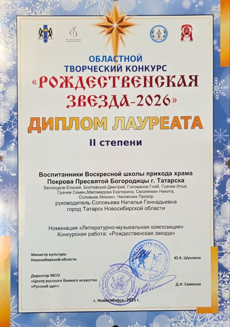 25 декабря воспитанники приходской Воскресной школы были награждёны дипломом лауреата II степени конкурса «Рождественская звезда 2026»